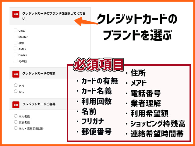 申し込み時には、氏名や住所、電話番号のほか、所持しているクレジットカードの種類や、利用希望額、ショッピング枠の残高などを申告しなければなりません。